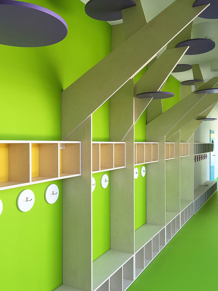 幼兒園是一層樓的設計,這個門廊般的建筑體量中有五個房間,兩間為托兒所準備,剩下三間為幼兒園所用。項目可以容納125個孩子。項目單斜面的屋頂使用的是膠合層壓的木結構。內(nèi)部庭院中有沙坑和樹,是“建筑體量的核心”。庭院處的墻壁上有一扇大窗戶向中庭敞開,這帶來了最大限度的自然光線。衣帽間和教室直接的聯(lián)系著。衣帽間中的窗戶可以滑動打開,以便于孩子們以盡可能短的方式達到花園。玻璃的走廊和低的屋頂是庭院的通道。它們模糊了內(nèi)外部空間之間的界限。