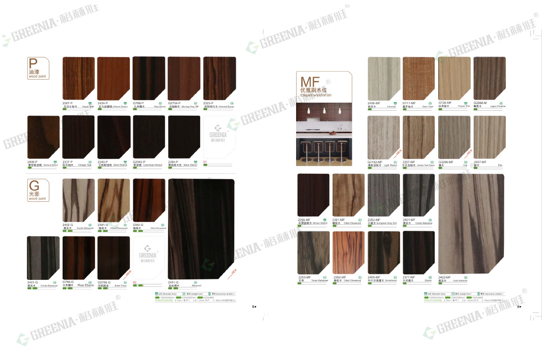 格林雅防火板擁有55種表面處理及3532種花色紋路,品種齊全。包括光面G、啞面M、絨面S、油漆P、霧面WS、波浪紋RS、壓木紋X、編織紋PX、優(yōu)雅皮紋XO、皮紋SL、壓木紋SH、拉絲ST、刷木紋F、優(yōu)雅刷木紋MF、絲絨面CF、羽翎面FT、纖絲紋、天然木皮、影點U、橫紋E、豎紋H、雨絲紋MV、橫紋WH、原木刷紋WB等多種不同的表面處理,可做成平板、彎曲板。歡迎您來樣定做!