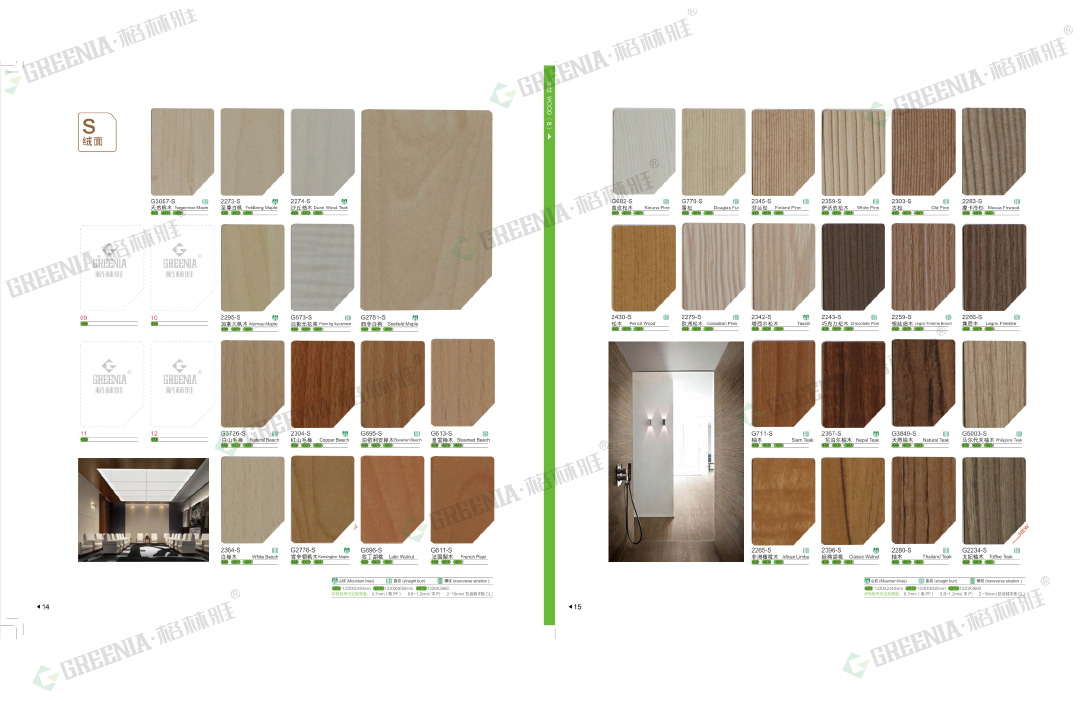 格林雅防火板擁有55種表面處理及3532種花色紋路,品種齊全。包括光面G、啞面M、絨面S、油漆P、霧面WS、波浪紋RS、壓木紋X、編織紋PX、優(yōu)雅皮紋XO、皮紋SL、壓木紋SH、拉絲ST、刷木紋F、優(yōu)雅刷木紋MF、絲絨面CF、羽翎面FT、纖絲紋、天然木皮、影點(diǎn)U、橫紋E、豎紋H、雨絲紋MV、橫紋WH、原木刷紋WB等多種不同的表面處理,可做成平板、彎曲板。歡迎您來樣定做!