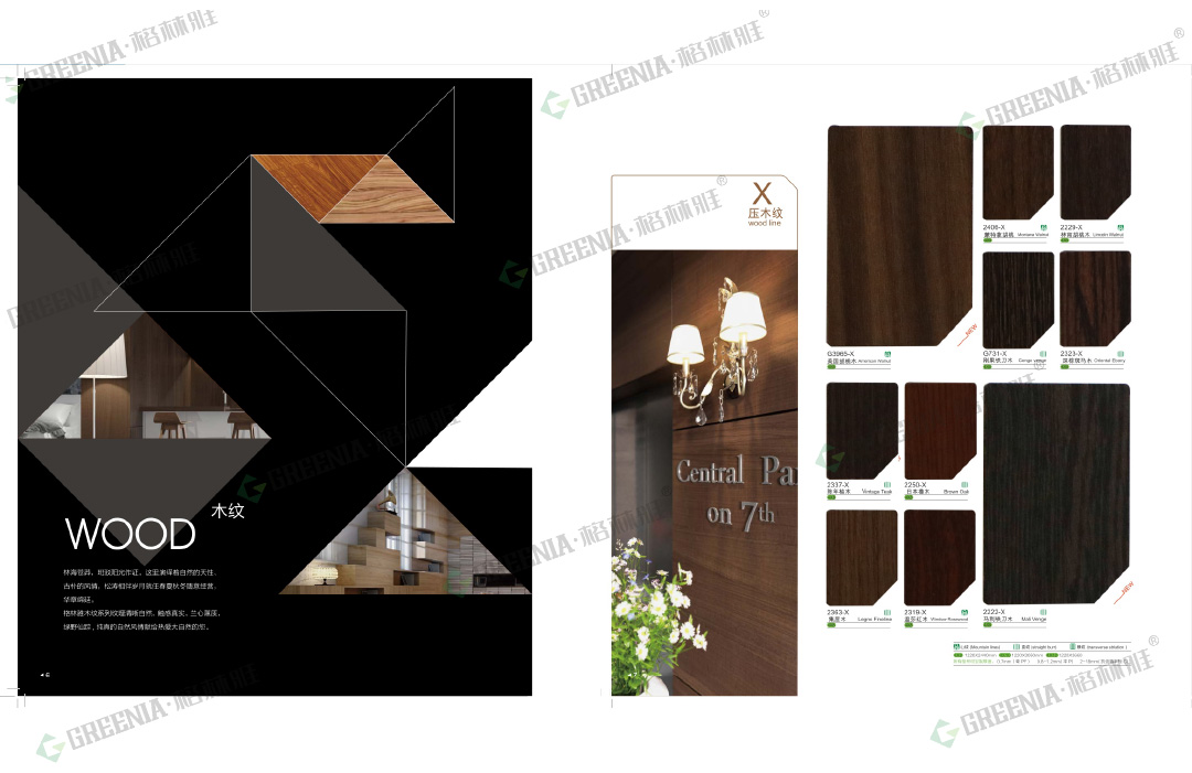 格林雅防火板擁有55種表面處理及3532種花色紋路,品種齊全。包括光面G、啞面M、絨面S、油漆P、霧面WS、波浪紋RS、壓木紋X、編織紋PX、優(yōu)雅皮紋XO、皮紋SL、壓木紋SH、拉絲ST、刷木紋F、優(yōu)雅刷木紋MF、絲絨面CF、羽翎面FT、纖絲紋、天然木皮、影點(diǎn)U、橫紋E、豎紋H、雨絲紋MV、橫紋WH、原木刷紋WB等多種不同的表面處理,可做成平板、彎曲板。歡迎您來(lái)樣定做!