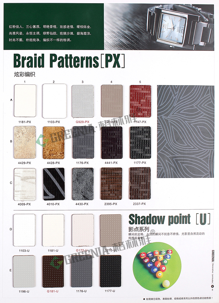 格林雅防火板擁有55種表面處理及3532種花色紋路,品種齊全。包括光面G、啞面M、絨面S、油漆P、霧面WS、波浪紋RS、壓木紋X、編織紋PX、優(yōu)雅皮紋XO、皮紋SL、壓木紋SH、拉絲ST、刷木紋F、優(yōu)雅刷木紋MF、絲絨面CF、羽翎面FT、纖絲紋、天然木皮、影點(diǎn)U、橫紋E、豎紋H、雨絲紋MV、橫紋WH、原木刷紋WB等多種不同的表面處理,可做成平板、彎曲板。歡迎您來(lái)樣定做!